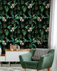 A lush arrangement of a tropical foliage, on a black background, inspired by the exotic gardens in Palm Spring.